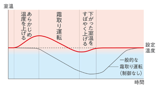 この機能があることで、冬場の除霜運転中でも室温の急激な低下を抑えることができます。